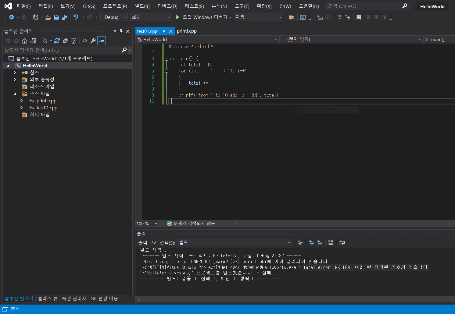 2. printf.cpp와 test01.cpp 둘 중 하나의 코드에 main() 함수를 제거한다.