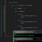 [이 포스팅은 시작하세요! C# 7.1 프로그래밍의 내용을 발췌하였습니다] [보기용 예제 소스 코드에서 오류 발생시에 댓글이나 방명록에 글을 남겨 주시면 수정/보완하겠습니다] 이번 포스팅에서는 선택문 중에서 Switch의 개념과 사용법에 대해서 알아보도록 하겠습니다 일단 정의부터 시작해보겠습니다 switch 문은 여러개의 if문을 사용하는 것과 비슷합니다 예를 들어여러 개의 조건을 판단해서 실행할 때 if / else if / else if / ... / else 처럼 쓸 수도 있지만 조건식의 값이 상수라면 if문 보다는 switch문이 더 편리할 수 있습니다 switch 사용 문법을 보겠습니다 switch (인스턴스) { case 상수식: 구문; break; case 상수식: 구문; break; . ...