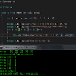 [이 포스팅은 시작하세요! C# 7.1 프로그래밍 의 내용을 발췌하였습니다] [보기용 예제 소스 코드에서 오류 발생시에 댓글이나 방명록에 글을 남겨 주시면 수정/보완하겠습니다] 이번에는 배열과 다차원 배열에 대한 기본 개념과 사용법을 포스팅해보도록 하겠습니다 일단 배열의 정의는 따로없지만 제가 직접 정의를 내린다고 한다면 어떠한 작업에서 필요한 일련의 데이터들을 순서대로 저장하는 메모리 공간 함수 라고 말할 수 있겠습니다 아마 배열은 대부분 C/C++/C# 모든 언어에서 중요한 역할을 하기에 정의를 쉽게 풀이하지않고 바로 넘어가겠습니다 기본적인 C#에서의 배열 문법은 아래와 같습니다 자료형 [] 배열이름 = new 자료형[배열자리수]; ex) int [] Array = new int[5]; string ..